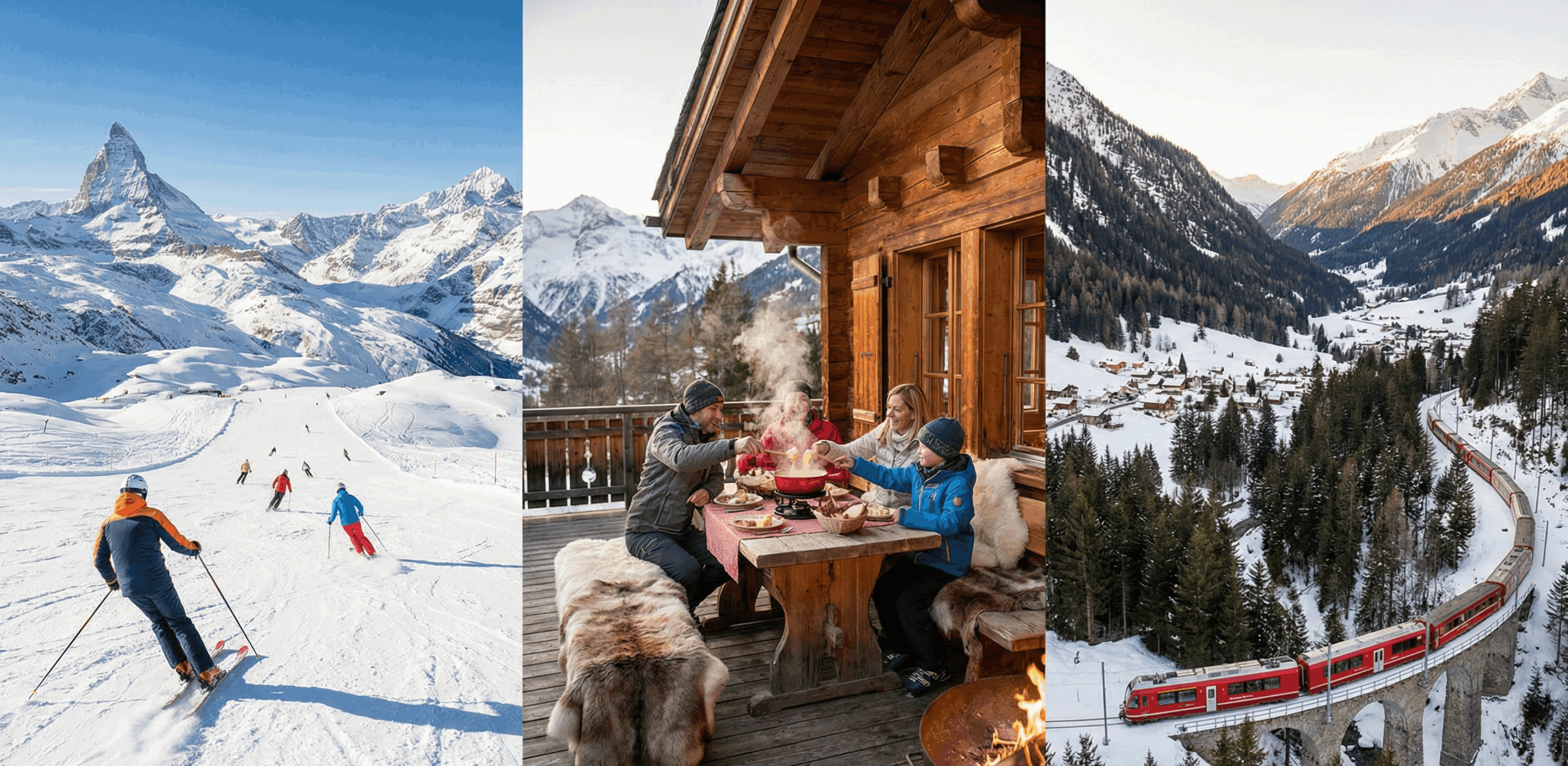 Alpi svizzere: sci panoramico, fondue in chalet e trenini tra montagne innevate